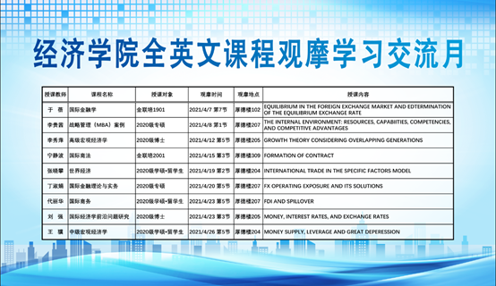 为推进学院国际化进程,促进全英文课程的数量增长和质量提升,学院前期遴选了29门全英文课程予以立项资助。经过一段时间的建设,学院将于4月份举办“全英文课程观摩学习交流月”活动,一方面为课程建设成果提供一个展示的窗口,另一方面为广大教师提供一个相互交流相互学习的机会和平台。此次观摩月活动主要面向本学期开课的本、硕、博层次的全英文课程,具体观摩信息如下:欢迎各位领导、老师莅临观摩、指导和交流