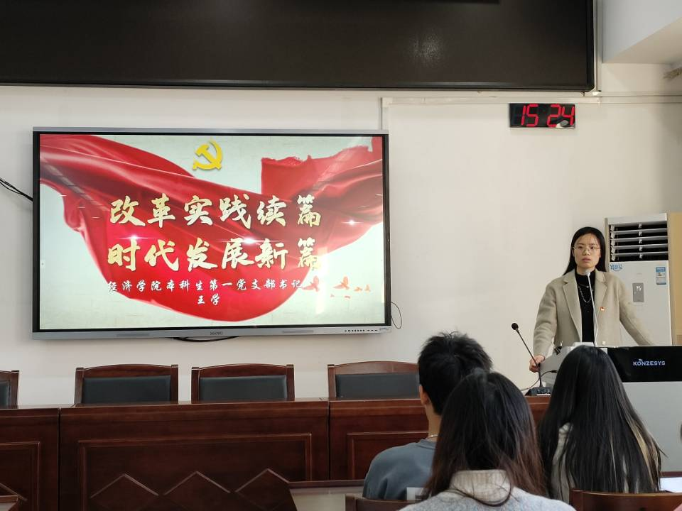 首先,王学带领全体党员共同学习回顾了中国改革开放的伟大历程。她指出党的二十届三中全会站在新的历史起点上,科学谋划进一步全面深化改革,这既是党的十八届三中全会以来全面深化改革的实践续篇,也是新征程推进中国式现代化的时代新篇,进一步彰显了我们党将改革进行到底的强大决心和坚强意志。接着,她结合利用丰富的数据和图表,直观展示改革开放以来我国在经济、科技、文化、民生等方面取得的伟大成就,进一步增强了同学们对改革开放的认同感和自豪感。随后,她结合教育领域和民生领域的改革实例引导同学们深入领悟“以人民为中心”的改革立场。最后,她结合改革进程中新时代青年勇于担当作为的事迹,引导学生充分认识到新时代青年是全面深化改革的见证者和受益者,也必将是进一步全面深化改革的参与者和贡献者,鼓励同学们要奋力书写为中国现代化挺膺担当的青春篇章。
