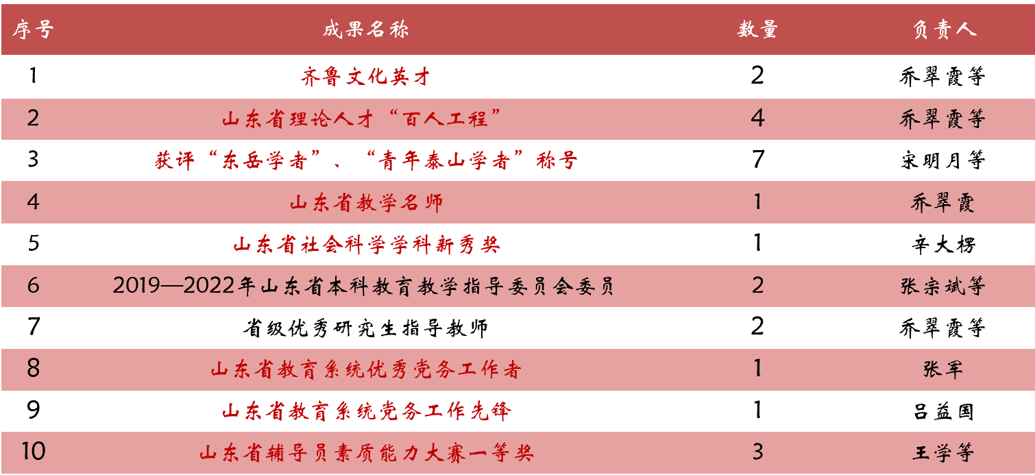近年来,学院在师资队伍建设方面取得一定成绩,10余人获评齐鲁文化英才、青年泰山、东岳学者学者等人才称号。