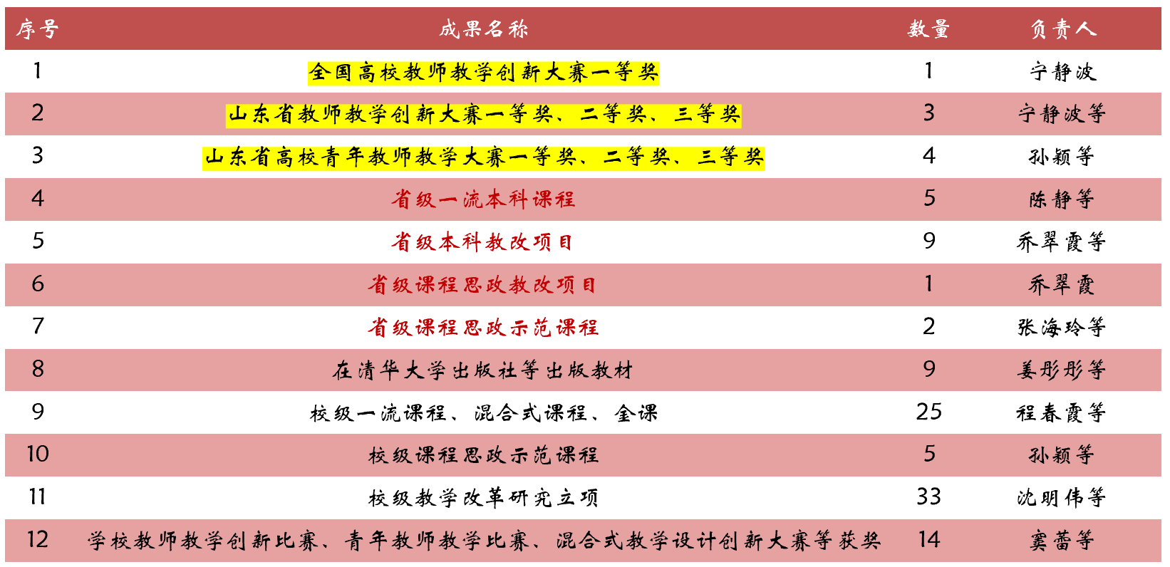 近年来,获得全国高校教师教学创新大赛一等奖等省级以上教学比赛奖项8项,获评省级一流本科课程、省级教改项目等近20项。