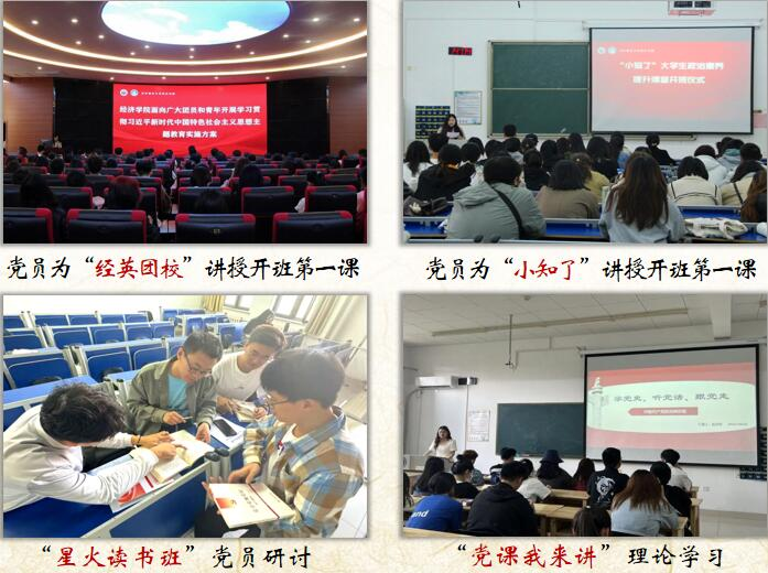 在党建品牌创建方面,一是打造“经英团校—‘小知了’课堂—星火读书班”党员政治理论学习品牌,形成党建带团建“矩阵式”工作模式。二是开展“星星点灯”党员导航实践活动品牌,发挥党员模范带头作用,增强宗旨意识和服务能力。三是实施党员“九个一”任务清单监督品牌,通过量化和定性考核监督,使党员管理更加有效。在工作机制创新方面,学院党委通过项目化运作、丰富党建活动载体、充实党建活动内容,不断提升支部组织活力。在多措并举开展党员教育方面,以“三依托、四结合”为教育理念,实现党建工作与学生工作的有机融合,将党员教育与专业学习、创新创业、社会实践、志愿服务相结合,成立项目小组,让党员在实践历练中提升综合素养。