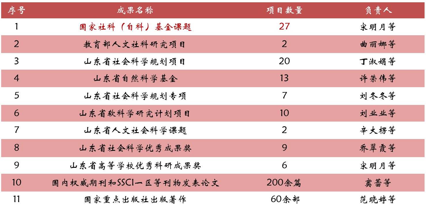 近年来,国家社科、自科课题立项27项,连续多年位于全校前列,立项省级以上科研项目近百项,获评山东省社科优秀成果奖等省级以上奖励近20项;高层次论文成果稳定产出,服务社会能力显著增强。本科生升学率不断攀升,研究生生均高水平发文排名已跃居文科学院第1名、全校第5名。
