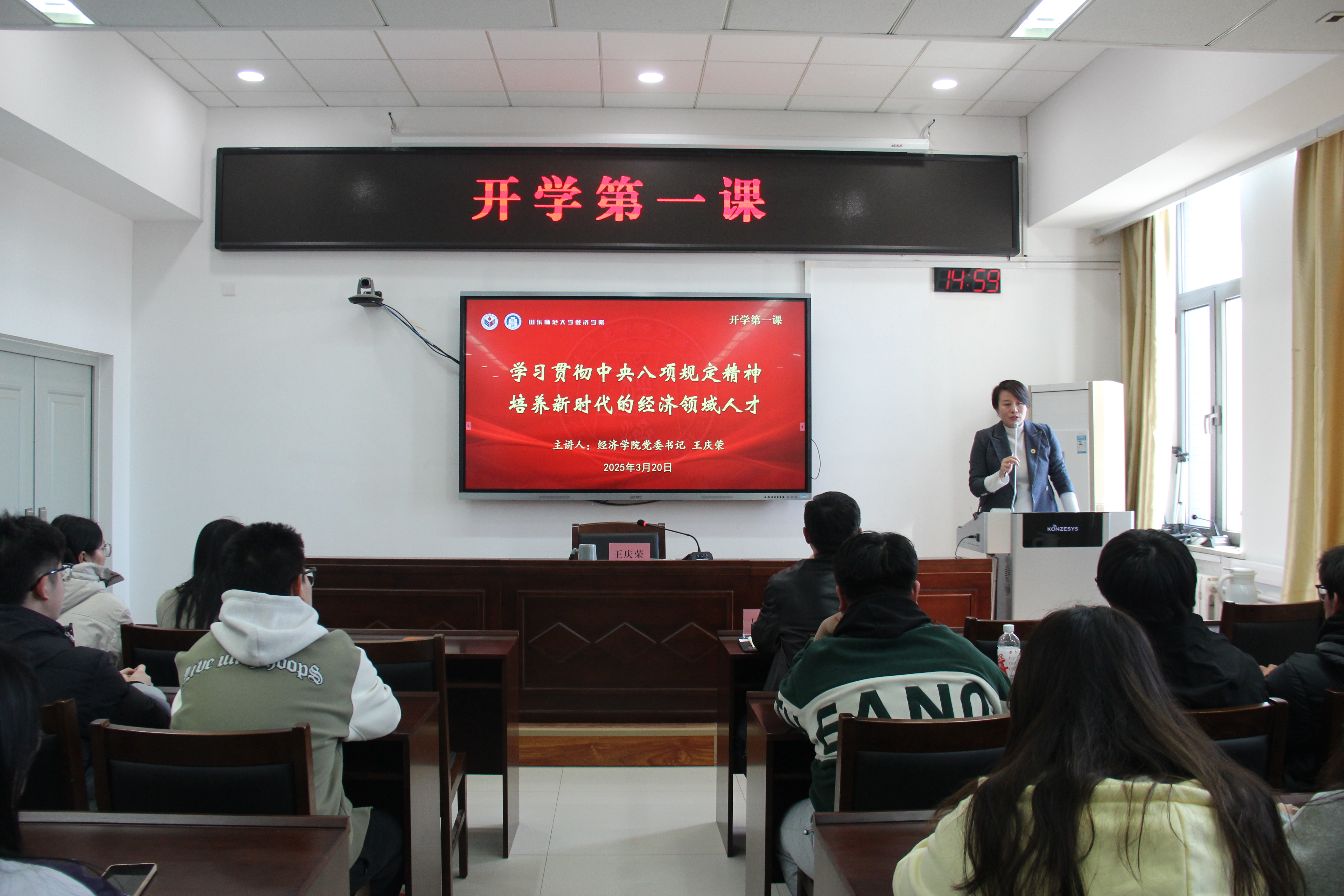 3月20日,英国正版365首页在厚德楼429会议室举行新学期开学第一课活动。学院党委书记王庆荣以《学习贯彻中央八项规定精神,培育新时代经济领域人才》为题作专题授课,党委副书记、纪委书记吕益国主持活动,学院学生党员、入党积极分子等80余人参加学习。