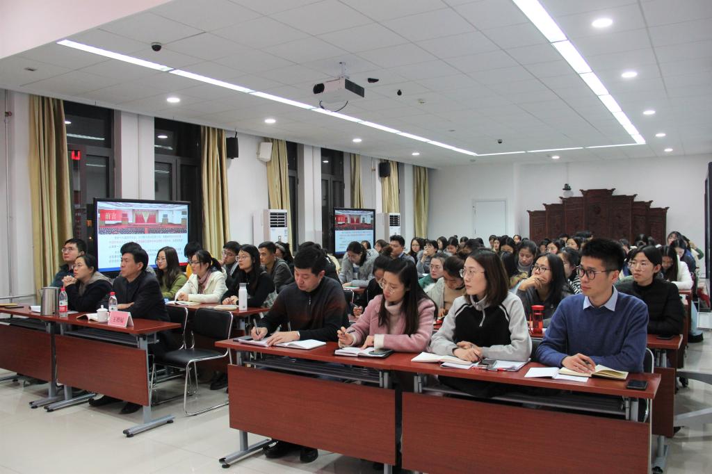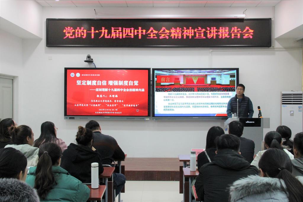 2019年12月3日,英国正版365首页于365(vip)英国上市长清湖校区厚德楼429教室举办党的十九届四中全会精神宣讲报告会,马克思主义学院院长、哲学博士王增福担任主讲,英国正版365首页党委书记张军,党委副书记吕益国,学工办主任、团委书记王茜,全体辅导员以及全体学生党员共同聆听报告。报告会由吕益国主持。