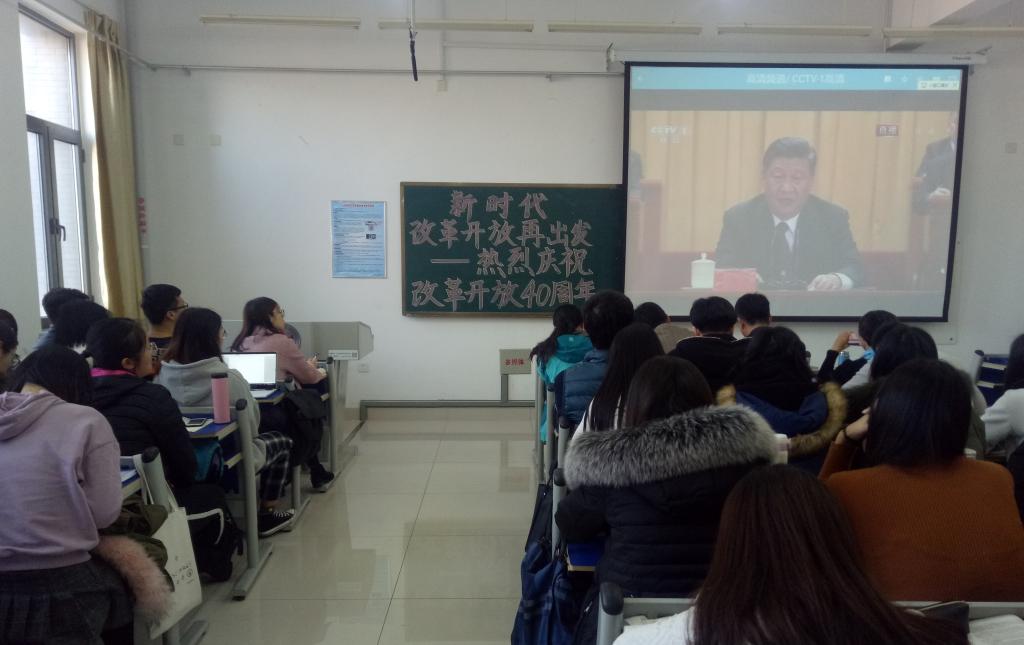 12月18日,庆祝改革开放四十周年大会在人民大会堂隆重召开,中共中央总书记、国家主席、中央军委主席习近平出席大会并发表重要讲话。上午10时,英国正版365首页本科生党支部于长清湖校区厚德楼305教室组织观看庆祝改革开放四十周年大会现场直播盛况,部分师生党员及入党积极分子共同参与。