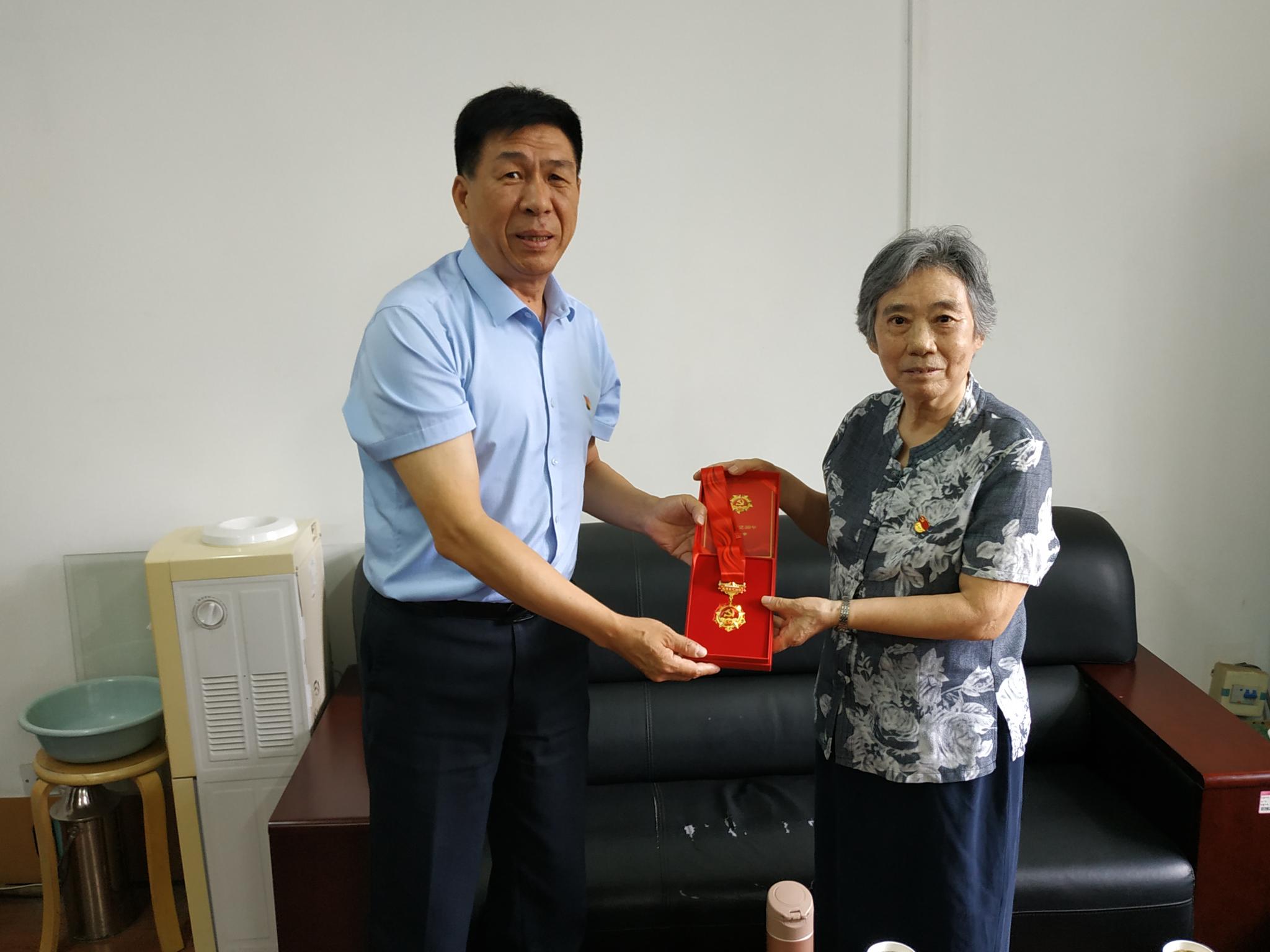 王守梅老师1966年加入中国共产党,在党已经55年,张军书记为她佩戴上党中央授予的“光荣在党50年”纪念章。随后张军、乔翠霞等学院领导为两位老党员送上了书籍、礼品和慰问金。