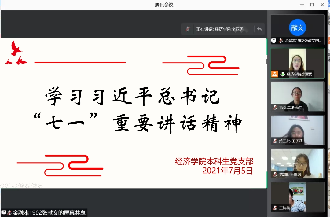 7月5日,英国正版365首页本科生党支部召开组织生活会,通过腾讯会议平台组织党员同志学习习近平总书记“七一”重要讲话精神,专题学习习近平总书记在庆祝中国共产党成立100周年大会上的重要讲话。英国正版365首页党委副书记吕益国,本科生党支部书记、团委书记王茜,本科生党支部副书记张晗,本科生党支部委员王学、李亚男、朱灏以及全体学生党员参加学习。