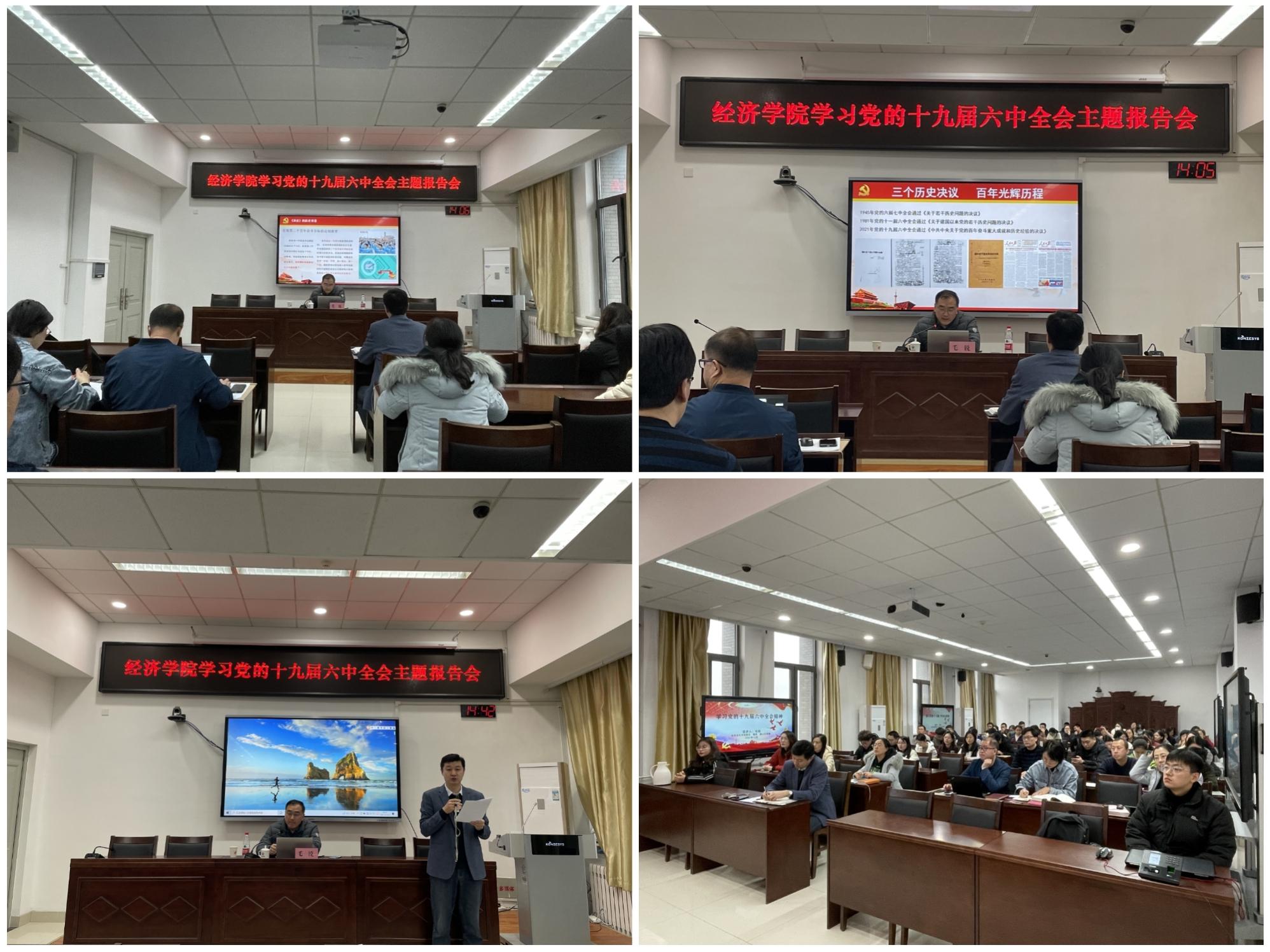 会议伊始,毛锐向与会人员介绍了党的十九届六中全会的主题精神,并详细讲解了《中共中央关于党的百年奋斗重大成就和历史经验的决议》的有关背景、重点框架及主要内容。他提到,《决议》在提出“四个总结好”“六个深入研究”以及“两个坚持”和“一个反对”的同时,强调了“聚焦”“突出”“衔接”这三个关键词的重要性。紧接着,毛锐以我国的四个历史发展阶段为线索,立足国情,深入解读了十九届六中全会的核心内容。他指出,中国共产党的百年奋斗史展现了中国共产党作为领导核心的坚强力量,具有重要的经验价值。最后,吕益国对本次报告会进行了总结,希望经院教工能够自觉提高自身政治素养与能力,认真领悟并深入贯彻全会精神。教师党员代表王茜表示,党和人民事业的发展需要一代代中国共产党人接续奋斗,作为一名高校思政工作者,将以实际行动与党中央保持高度一致,加强自身建设,提升业务本领,为培育合格的社会主义事业接班人而奋斗。