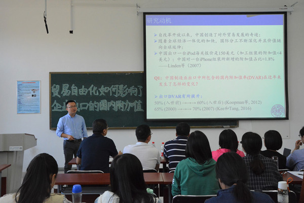 报告伊始,毛其淋博士结合中国加入WTO后积极参与全球分工但存在全球价值链低端锁定等问题的现实背景,介绍论文的选题意义和研究目标。之后,从理论模型构建、机制分析到进一步的基础回归、中介效应分析、动态分解及再配置效应检验,为大家全面系统的展示了贸易自由化对出口企业国内附加值的微观影响及影响渠道。毛其淋博士严谨的学术精神、严格规范的写作能力、深入浅出的报告讲解,获得与会师生的一直好评。最后,王耀辉对报告作出点评,鼓励老师和同学们多向毛博士请教学习,进一步提高学术严谨规范意识和科研素养。