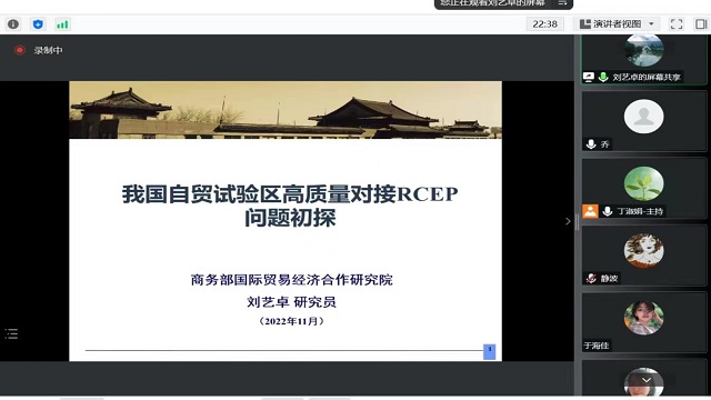 随后,刘艺卓研究员详细介绍了RCEP原产地声明“落地”各自贸试验区、北京自贸试验区成立B&R·RCEP创新服务中心、海南自贸港跨境服务贸易负面清单及烟台片区“空中快线”助力畅通RCEP物流通道四个自贸试验区高水平对接RCEP开放情况。什么是高质量对接?刘艺卓研究员认为,第一要做到全方位对接,不仅要从传统的货物贸易、服务贸易、投资领域进行对接,还要考虑边境后规则的对接改革;第二要高水平对接,不仅要落实明确承诺开放硬任务,还要考虑RCEP中软义务,并逐步转化为硬性开放义务;第三要统筹考虑开放发展和产业安全。最后,刘艺卓研究员从发展战略、原产地和贸易便利化、服务业扩大开放、强化投资等方面提出对策建议。