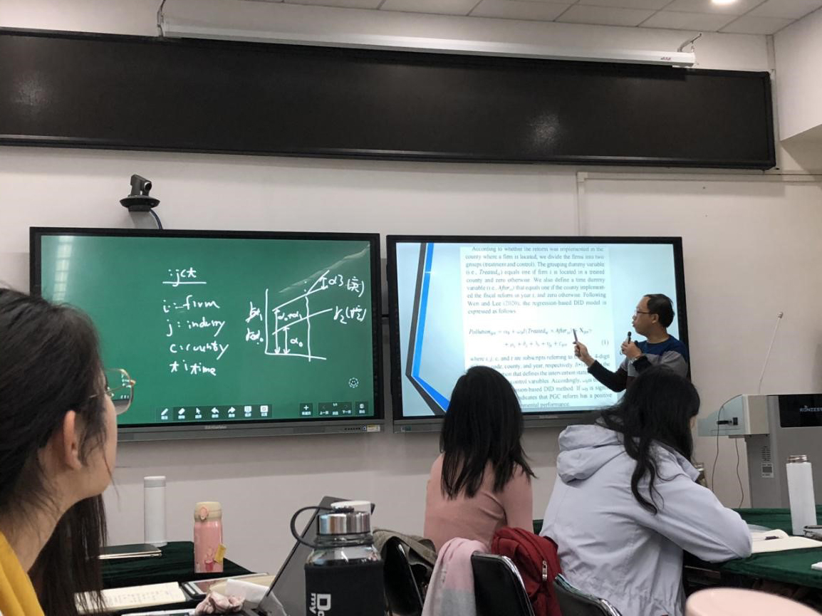 大讲堂由李建强教授主讲,主要面向硕、博士研究生、青年教师讲授高级计量经济学。李教授以强调计量应用及搭配英文学术论文为讲授特色,结合自身发表的权威英文期刊文章,从基本回归模型出发,系统介绍了结构转变模型、分位数回归模型、非直线模型、面板模型( 基本, 静态) 、动态面板模型GMM、空间计量模型等计量经济学模型,此外,还讲解了DID双重差分、 断点回归、 PSM倾向得分匹配法等几种时下比较流行的研究方法。李教授的讲解深入浅出,丰富生动,深受学生欢迎。
