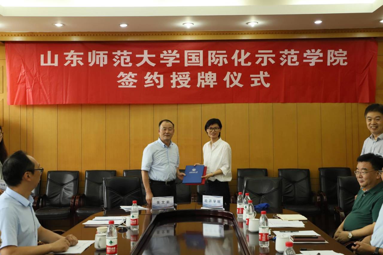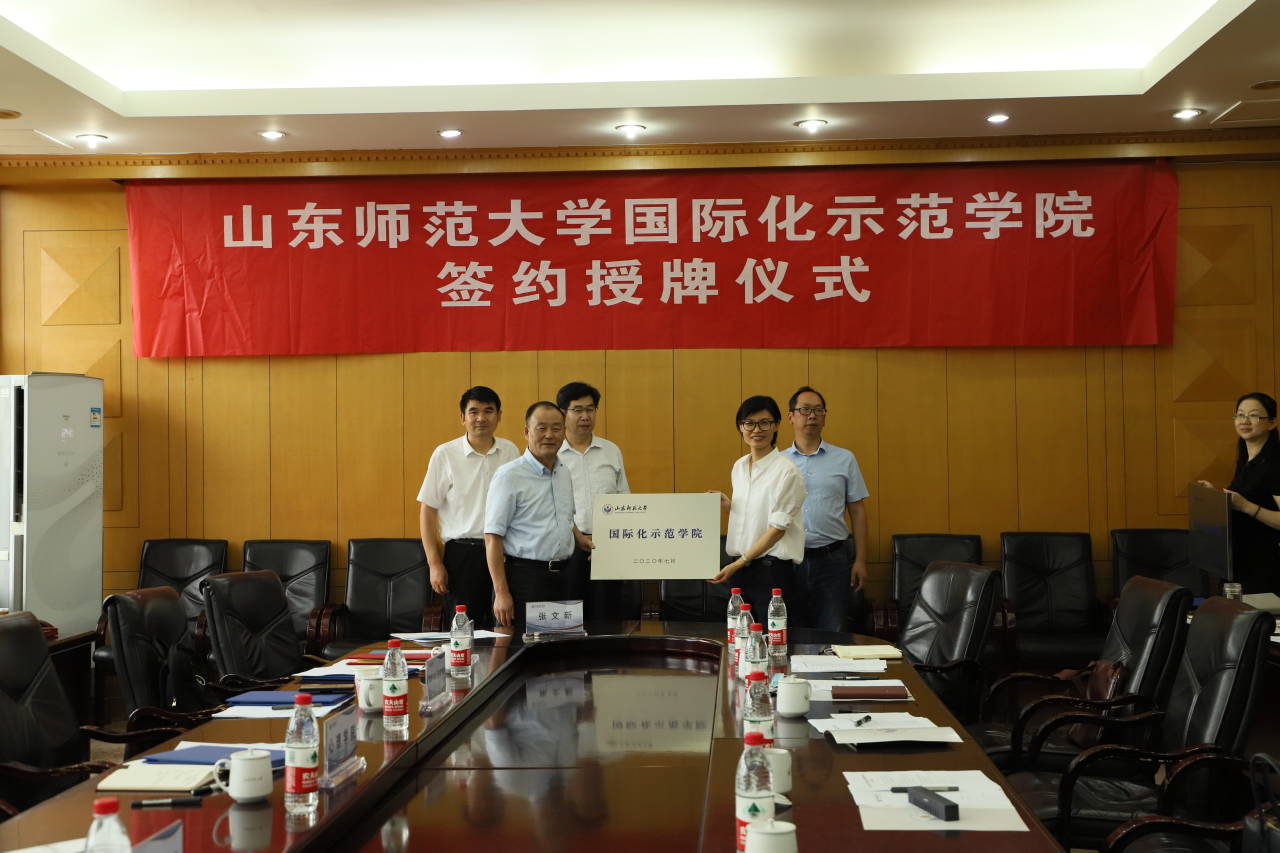 7月3日下午,365(vip)英国上市国际化示范学院签约授牌仪式在千佛山校区文化楼三楼会议室举行。校党委副书记、党委外事工作领导小组副组长张文新、英国正版365首页、心理学院、商学院、物电学院四所国际化示范学院院长和学校党委外事工作领导小组部分成员单位负责人参加了会议。