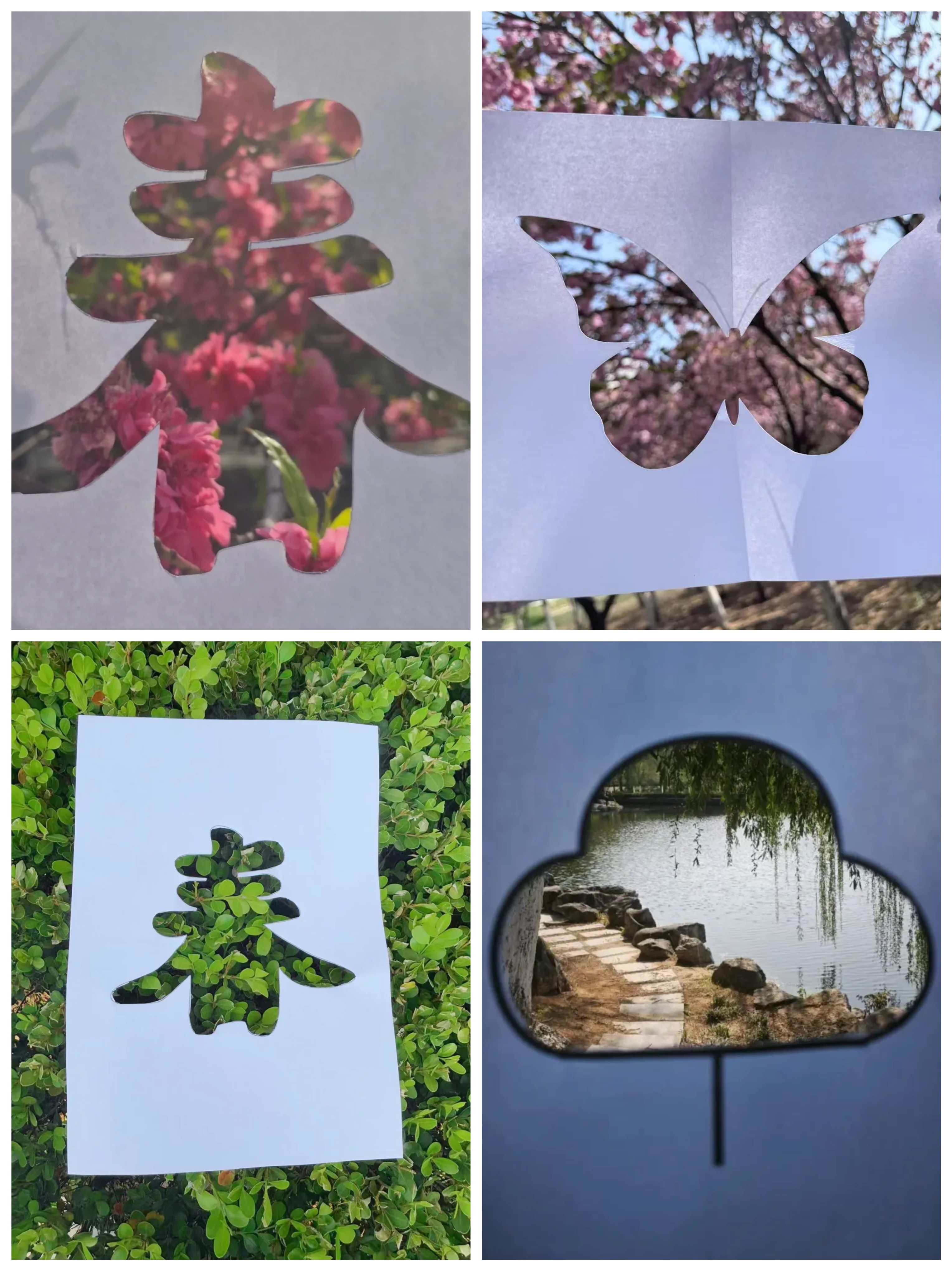 活动现场设有“定格春天”“制作我的春日娃娃”“看见春天的颜色,奔赴春天的约会”三个趣味项目。在“定格春天”环节,同学们手持镂空纸置于花草树木之上,以独特视角拍摄春天美景。在“制作我的春日娃娃”环节中,大家在户外收集落叶、花瓣等自然材料,为娃娃装扮出一件件富有创意的春装。“看见春天的颜色,奔赴春天的约会”环节里,同学们两两搭档,先在纸上圆圈内绘制春天的色彩,再去户外寻找对应颜色的树叶、花瓣等物品进行粘贴,共同完成捕捉春天色彩的创意作品。活动现场秩序井然,志愿者们热情提供帮助,保障活动顺利进行。
