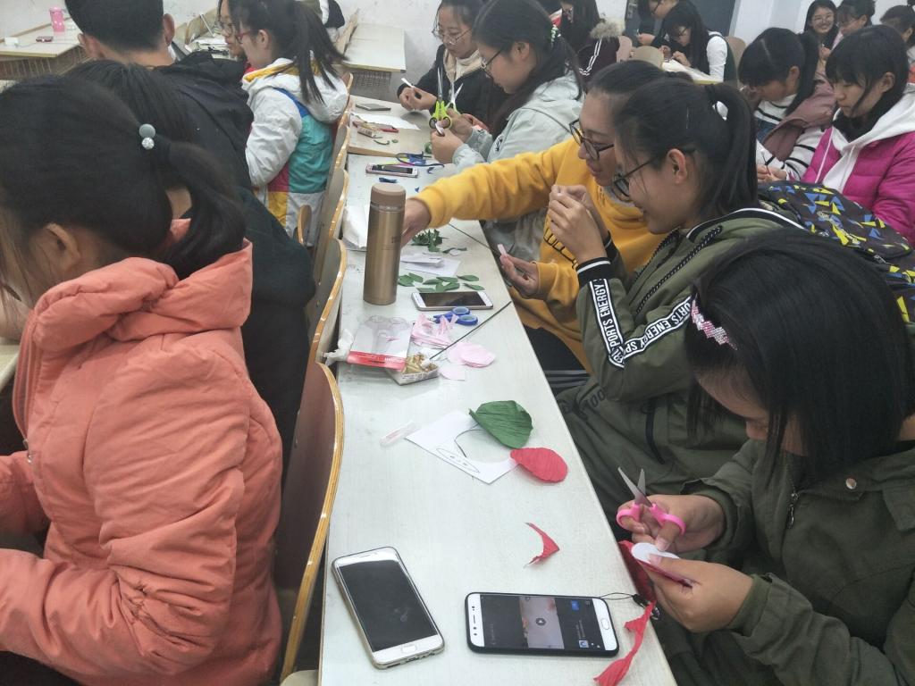 活动伊始,社团老师对折纸需要的工具进行简单介绍,将折纸及乳胶等工具分配给同学们。在老师的讲解下,同学们拿起桌上的花瓣模板,迫不及待的动手制作起来。制作过程中,粘贴花瓣这一步骤是整个花朵折纸制作中做困难一项,为此,副社长许娜耐心地为同学们讲解粘贴花瓣要领,随着时间的流逝,同学们手中的玫瑰花及康乃馨大都已成型,深蓝、粉红、亮黄……各种颜色的花绚烂纷呈。随后,现场同学在所制花朵折纸上点缀亮晶晶的装饰,美丽无可挑剔。活动之末,同学们纷纷展示自己亲手制作的花朵,点燃了全场的高潮。而后,同学们将手中的花聚集在一起,社团人员拍照留念,活动在欢声笑语中结束。