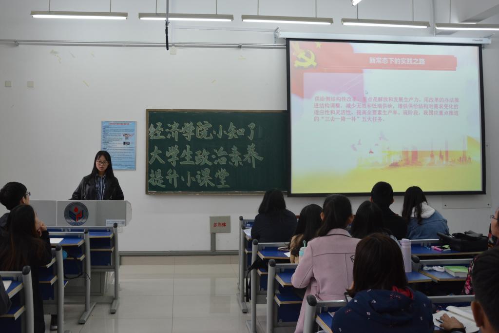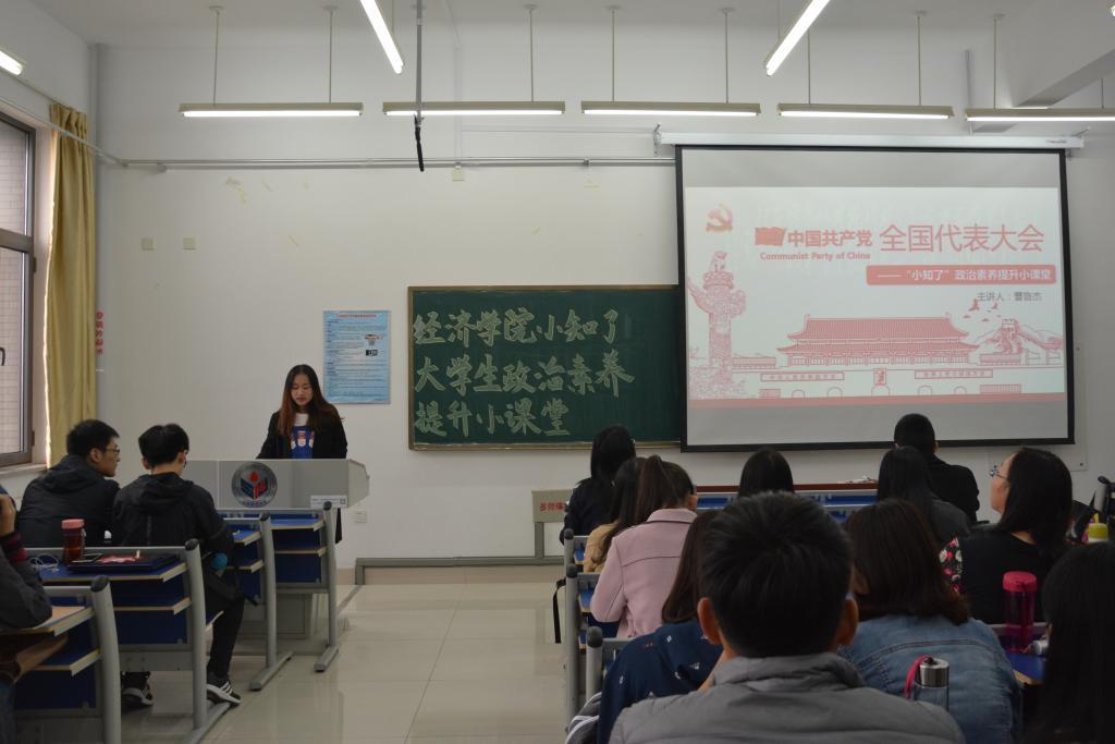 10月17日,值此党的十九大即将召开之际,英国正版365首页本科生第二党支部于长清湖校区英国正版365首页综合楼305教室组织“小知了”大学生政治素养提升课堂之喜迎十九大专题学习活动。党支部书记、2015级辅导员李明菊到场聆听,学习活动由2015级期货班曹鲁杰、2015级经济班吕丽娟担任主讲。