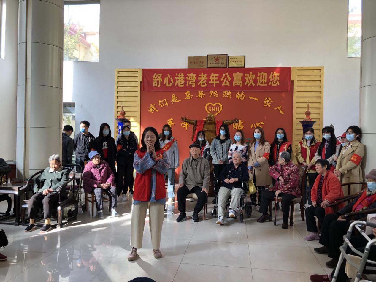 活动伊始,同学们为老人们展示自己提前准备的节目。丰富多彩的表演为老人们带去活力与快乐,让长期身处敬老院的老人们感受到年轻一辈的关切与体贴。接着,各位学生为老人们送上水果与鲜花,并细心地将水果削皮切块,置于盘中端与老人。与此同时,同学与老人促膝长谈,分享自己作为年轻一代的见闻与疑惑,聆听老一辈的往事与经历。随后,同学们与在场老人们进行简单的游戏互动,为在场老人带来更多的欢乐,并帮助老人们打扫敬老院的大厅与房间,老人们居住环境得以更加整洁舒适。同学们为老人们送上精心制作的卡片,并在卡片上写下对老人们的祝福,将其放在老人们的床边桌上。最后,同学们和老人们一起合影留念。