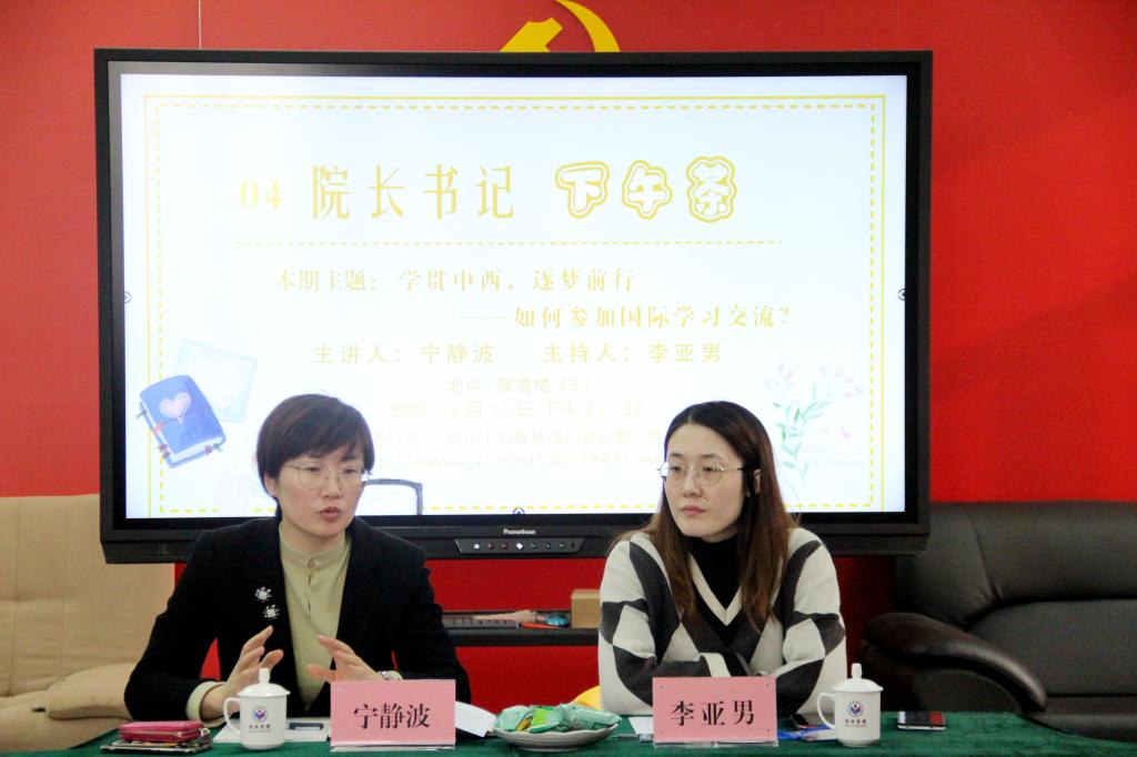 12月10日,英国正版365首页于厚德楼431活动室举办第四期“院长下午茶”活动。本期活动以“学贯中西,逐梦前行——如何参加国际学习交流?”为主题,由英国正版365首页副院长宁静波主讲,十名本科生代表参与,辅导员李亚男主持活动。