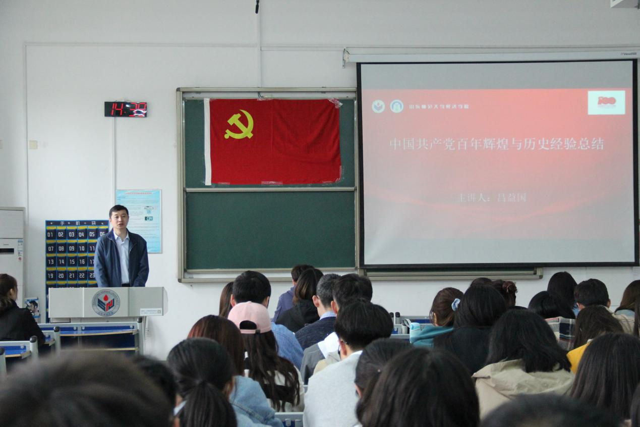 典礼上,吕益国作了题为 《中国共产党百年辉煌与历史经验总结》的专题报告。他按照时间顺序带领同学们回顾中国共产党的百年历史辉煌,帮助同学们更加系统、完整地学习百年辉煌党史。在讲解党史的过程中,吕益国为同学们介绍了众多英雄人物、英雄事迹,以突出中国共产党先烈们的英勇无畏与无私奉献,增强同学们的责任感与使命感。随后,他与同学们分享了他从中国共产党百年发展史中总结的十余条历史经验启示,并谈到,我们要坚持中国共产党的领导,坚持走中国特色社会主义道路,坚持以人民为中心的思想等经验启示,提高同学们的政治素养与理论素养。