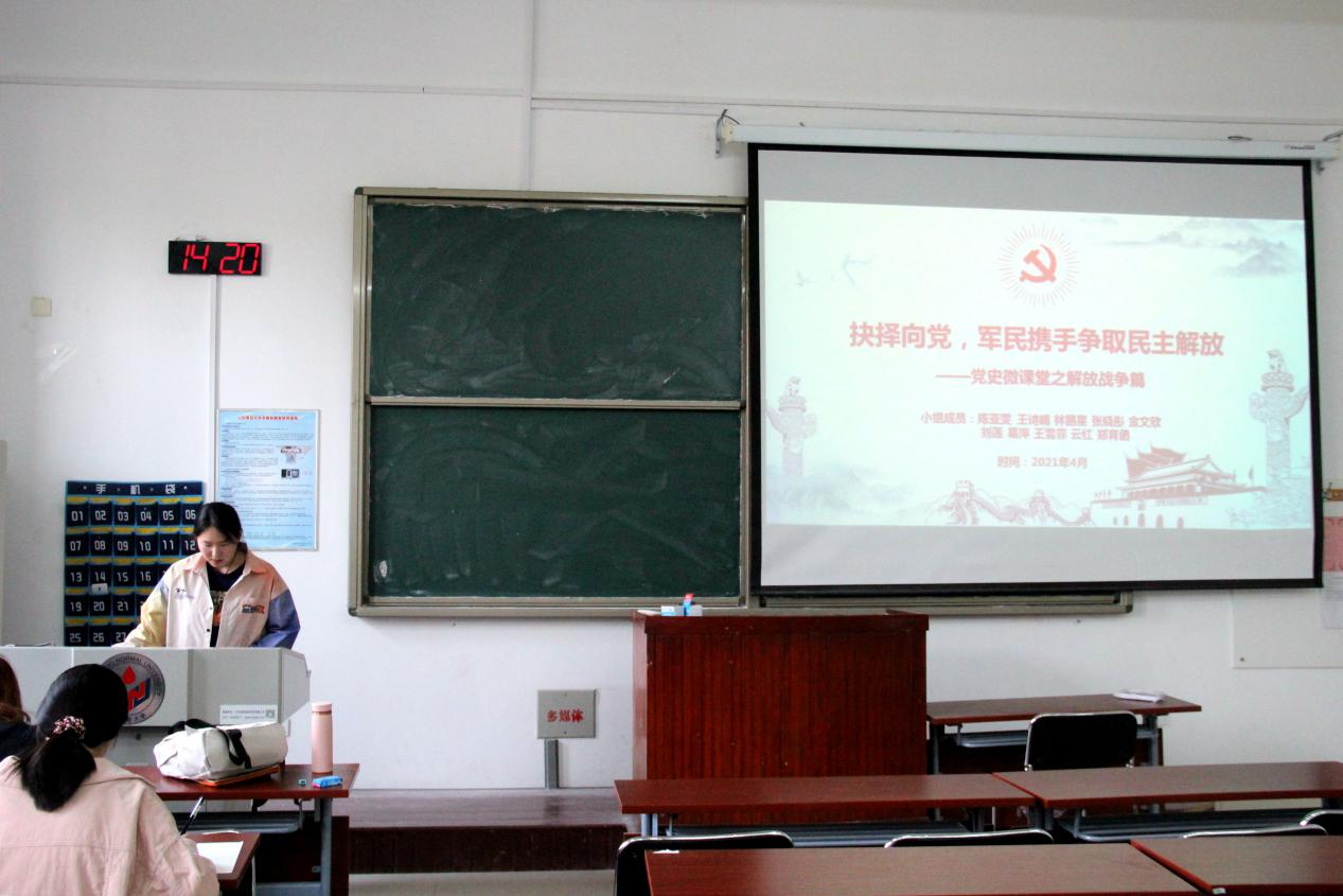 4月8日下午,英国正版365首页于厚德楼107教室开展“小知了”大学生政治素养提升课堂学习活动。本期专题学习活动以“抉择向党,军民携手争取民主解放”为主题,由金融本1802班陈亚雯担任主讲人,英国正版365首页部分预备党员和入党积极分子到场聆听。