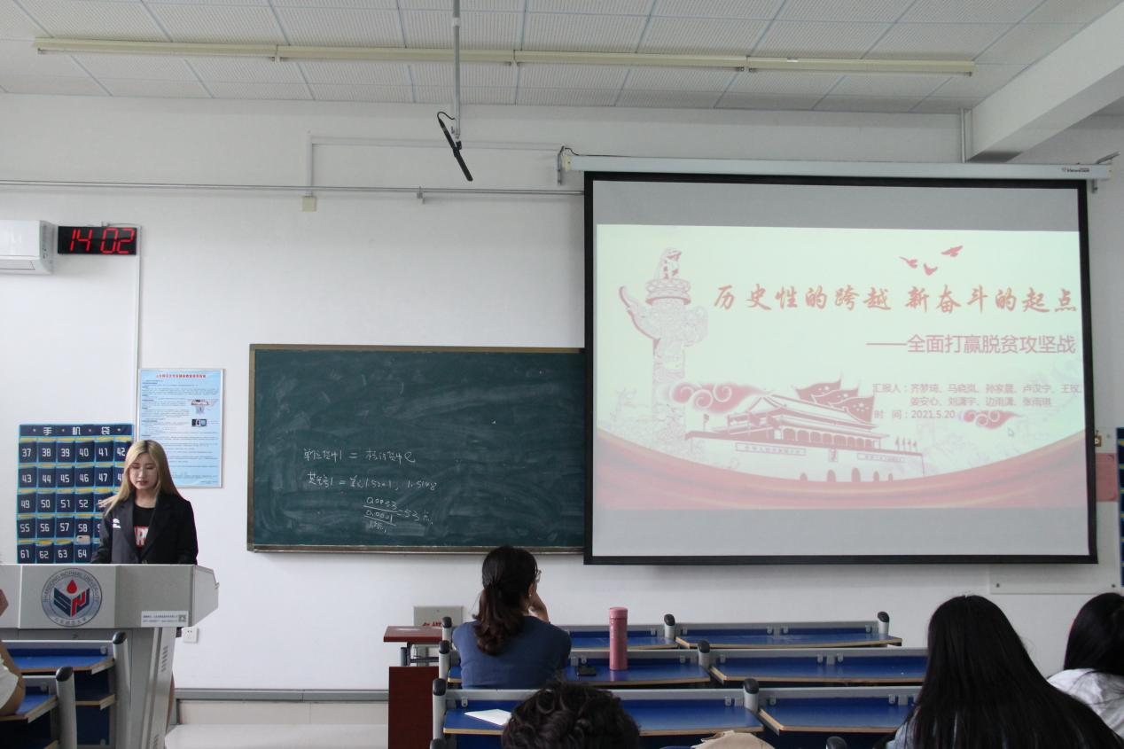 活动伊始,齐梦琦为大家简要介绍了脱贫攻坚战及其背景,详细列举了脱贫攻坚的六大举措,并带领大家一起回顾脱贫攻坚的主要历程。她表示,脱贫攻坚战的胜利,标志着中国在现行标准下消除了绝对贫困,这是世界上的减贫奇迹。随后,齐梦琦为大家介绍了白晶莹、黄文秀、王景贤三个脱贫攻坚典型人物,充分展示了在脱贫攻坚工作中,数百万扶贫干部倾力奉献、苦干实干,同贫困群众想在一起、过在一起、干在一起的感人肺腑的先进事迹。她讲到,在脱贫攻坚斗争中,有1800多名扶贫干部将生命定格在了脱贫攻坚征程上,生动诠释了共产党人的初心使命。作为新时代青年,我们使命在肩,应努力学习,不断增强自身能力,不断向优秀党员看齐,为社会主义事业建设和实现中华民族伟大复兴的中国梦而不懈奋斗。