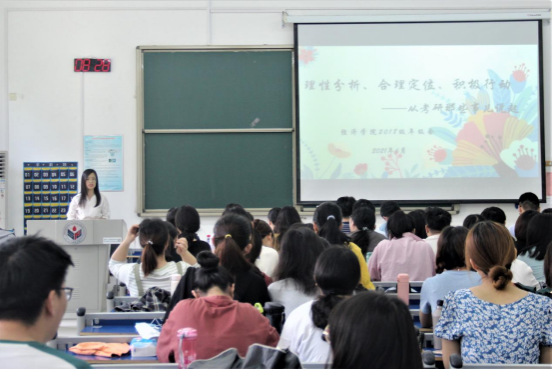 王学以当前大三年级学生普遍关心的考研为主要内容,有针对性地帮助学生克服规划选择困难。通过往年学院考研数据分析、引导学生自我合理定位、积极采取行动等三个方面,引导学生做出理性选择和合理规划。同时,从学生的视角出发,分析了学生考研过程中会遇到的困难和挑战,鼓励同学通过坚持不懈的努力取得成功。整个年级会内容丰富、互动有序、效果良好,2018级学生许晓诺反馈说“每月一次的年级会王学老师都精心准备,选题都是我们最关心的问题,通过这次年级会,我对考研有了清醒的认识,更加坚定考研目标。”