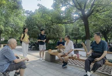 活动之初,团队成员来到社区老年人活动中心,陪同老人聊天,为老人们讲解养生小知识,了解老人的日常生活与心理健康状况。当谈及生活水平的状况时,其中一位老年人分享说:“比起建国初期,如今的生活已然发生了翻天覆地的变化,出行、购物方便了,养老保障政策也越来越完善。我们这代人最大的愿望就是落叶归根、儿孙满堂。”