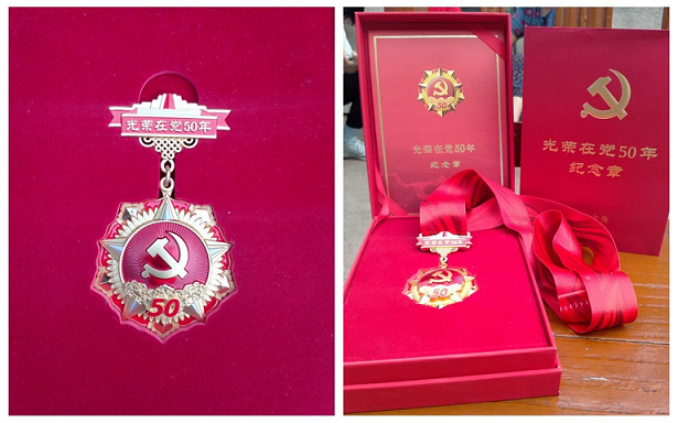 董维磊爷爷向成员们展示“光荣入党五十年”纪念徽章
