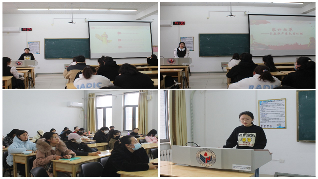 活动伊始,王艺琪向大家详细介绍了家庭联产承包制的背景及发展历程。她谈到,家庭联产承包责任制是改革农业原有经济体制的重要开端,是顺应时代发展的产物,在时任国务院副总理万里和改革开放总设计师邓小平的支持下,家庭联产承包责任制成功调动了农民的生产积极性,解放了农村生产力,实现了中国农村改革与发展的“第一次飞跃”,为全面经济体制改革提供经验。随后,陈鑫向大家分析了家庭联产承包责任制的实质与特点。她提出,家庭联产承包责任制是特定社会经济条件下的历史选择,实现了土地集体所有权与经营权的分离,确立了以户为单位的家庭承包经营的新型农业耕作模式,充分发挥了集体的优越性和个人的积极性,在改变农村经济格局的同时,奠定了经济发展和后续改革的基础。