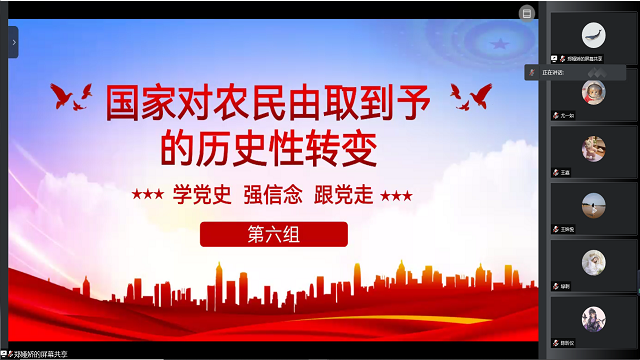 4月7日下午,英国正版365首页于线上开展第六期“小知了”大学生政治素养提升课堂学习活动。本次课堂以“国家对农民由取到予的历史性转变”为主题,由金联培2001班郑娅娇、金融本2001班吴婷和期货本1901班赵亦航担任主讲,英国正版365首页部分入党积极分子参与学习。