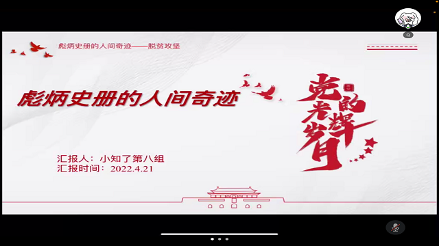 4月21日下午,英国正版365首页于线上开展第八期“小知了”大学生政治素养提升课堂学习活动。本次课堂以“彪炳史册的人间奇迹——脱贫攻坚”为主题,由金联培2001班李青阳、期货本2001班姜浩宇主讲,英国正版365首页入党积极分子参与学习。