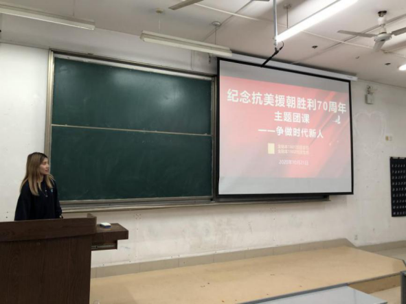 10月21日,英国正版365首页金融本1801班团支部开展“纪念抗美援朝胜利70周年——争做时代新人”主题团课,团支部书记马晓岚担任主讲,金融本1801班全体同学到场学习。