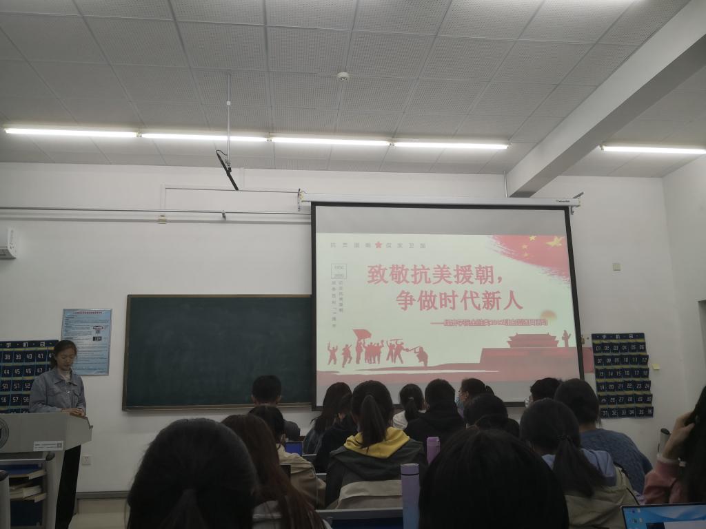 除此之外,金融类2002班举行了以抗美援朝为主要内容的主题班会。会上,团支书朱琛进一步强调了“铭记历史,珍爱和平”的主题思想,并且为本次活动做了进一步升华。随后开展了经典抗美援朝影视作品观看,历史介绍等活动。通过一系列的主题教育,让各位同学更加深入了解了抗美援朝的历史,提升了同学们对战争以及和平的进一步认识,同时也向因战争而失去生命的英雄致敬。班会结尾,同学们写下了对此次本次活动的心得,并纷纷表示为志愿军们感到自豪,作为共产主义接班人的我们应该时刻秉持使命担当,不负大国情怀,用青春的力量点亮祖国的未来。