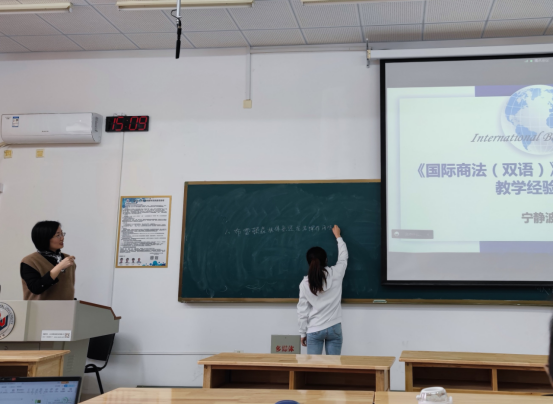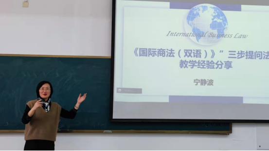 分享会上,宁静波老师以《国际商法(双语)》课程为例,介绍了该课程教学改革创新的历程,以及在教学内容、教学方法和手段、教学评价方式、课程思政建设方面所进行的创新,重点介绍了“三步提问法”的教学方法并进行了示范展示。“三步教学法”基于提升学生的思维能力、创新能力为目标,以学生为主导,使其成为学习主动者,提升了教学效果,受到学生欢迎。与会老师就教学创新问题展开了深入交流,并就未来自身主讲课程的教学创新提出了自己的设想。