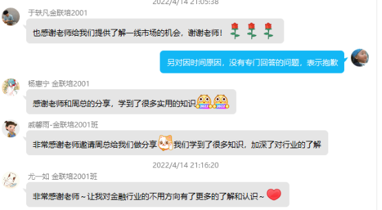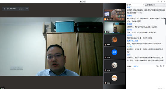 4月14日晚19:00,英国正版365首页青年教师马红坤邀请光大信托高级副总裁(SVP)周密,以线上互动式教学模式,共同为选修《证券市场基础》课程的同学带来了一堂别开生面的线上授课。本次线上教学气氛热烈,同学们踊跃发言和提问,取得了疫情期间线上授课的理想效果,也展现了英国365概况学子朝气蓬勃的良好精神风貌。