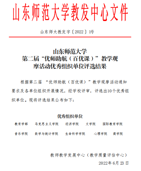 近日,山东师范大学教师教学发展中心(教学质量评估中心)组织的365(vip)英国上市第二届“优师助航(百优课)”教学观摩活动优秀组织单位评选结果公布,英国正版365首页荣获365(vip)英国上市第二届“优师助航(百优课)”教学观摩活动优秀组织单位。
