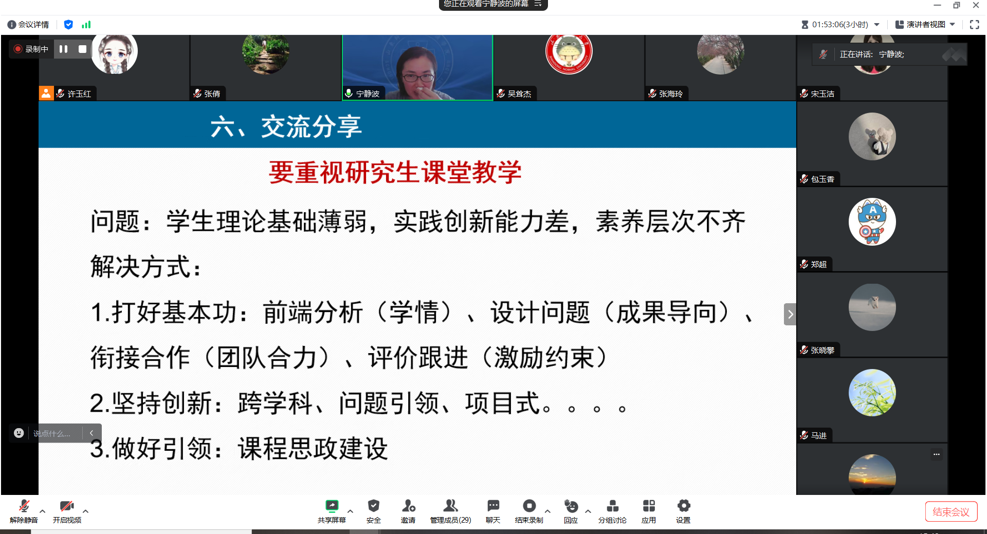 此次集体备课共有11位教师汇报课程教学安排,其中既有教学经验丰富的资深教师,也有近几年入职的青年教师。虽然第三学期开设的课程大多是专业选修课,但老师们的重视程度丝毫不减。无一例外地,各位任课教师都做了充分准备,精心设计教学内容,探索多元化的教学方法,注重学情分析和课程思政。宁静波教授在说课之后,还向老师们分享了假期中参加的教学培训和心得。