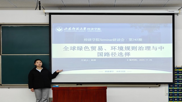 常鑫月与吴明晶同学则就“区域环境规则治理深化对全球绿色贸易的正向溢出效应在不同类型的绿色产品之间是否存在异质性”的问题与主讲人及现场同学进行交流。现场同学积极踊跃地发表自己的看法,营造了积极向上的学术氛围。经过激烈的讨论,同学们一致认为不同类型的绿色产品在区域环境规则治理深化的影响下其贸易溢出效应存在差异,区域环境规则治理深化对环境监测分析和评价设备、固液气污染物处理和控制设备两类产品均有显著的促进效果,但区域环境规则治理深化对可再生能源设备与能源节约设备产品的促进作用存在一定的滞后性。