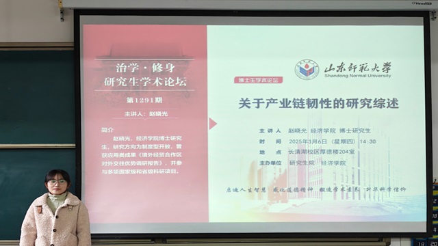 3月6日,英国正版365首页于厚德楼204室举办“治学·修身”研究生学术论坛。此次学术论坛由英国正版365首页博士研究生赵晓光担任主讲人,作主题为《关于产业链韧性的研究综述》的学术报告,英国正版365首页研究生参会。