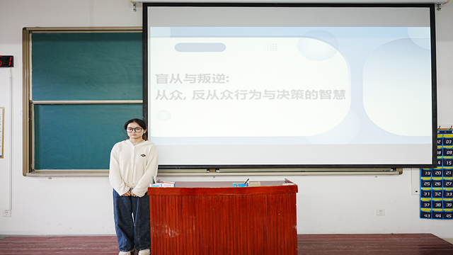 主讲人陈笑航同学分享了《盲从与叛逆》一书。她首先从生物进化的角度切入,指出人类的从众本能源于群体生存优势。这种从众行为具有双重性,一方面它能帮助个体规避风险,另一方面它能引发盲目跟风的非理性选择。其次,主讲人引用了书中的“纠正性错配”理论来解释反从众行为,强调反从众行为在初期可能面临社会排斥,但它能够激发创新活力,推动社会的进步。随后,她以“凯恩斯挑战传统经济学理论”“创业者通过私有信息对抗市场”为例,说明叛逆者如何通过独特的视角打破从众效应,进而为社会问题提供新的解决方案。最后,主讲人分享了个人的读书感悟,她建议同学们用“双核思维”来培养理性认知能力,即通过快速思维实现群体共情,通过慢思维守护理性,提升自己在信息洪流中保持清醒和独立思考的能力。