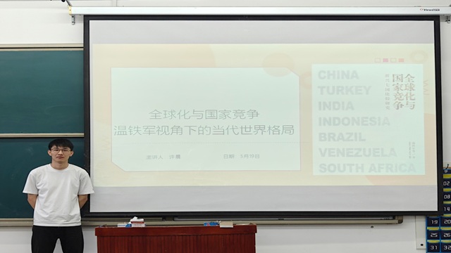 主讲人许晨同学分享了《全球化与国家竞争》一书。他首先介绍了全球化与国家竞争的现实问题:一是发达国家通过技术垄断和金融霸权持续获取超额利润,而发展中国家却陷入“低端锁定”的发展困境;二是全球财富分配的马太效应愈发显著,国家间的发展鸿沟不断加深。随后,主讲人以亚洲金融危机为切入点,深入剖析了全球化中的不平等现象,这场危机看似是国际游资冲击导致的金融动荡,实际上是发达国家通过金融自由化等政策将风险转移给发展中国家。最后,主讲人分析了中国应对全球化挑战的具体实践:中国创造性地走出了一条既深度参与全球化进程又保持发展自主性的成功道路——从加入WTO后的产业转型升级,到“一带一路”倡议下的新型国际合作;从构建“双循环”新发展格局,到推动人民币国际化进程;从打造自主可控的产业链供应链,到数字经济领域的创新突破。这些实践不仅展现了中国作为最大发展中国家在全球治理体系中的责任担当,更为破解全球化困境提供了具有世界意义的中国方案。