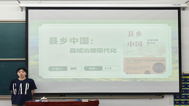 主讲人郝芮分享了《县乡中国》一书。她首先介绍了书籍作者及其创作意图。杨华是武汉大学社会学教授、中国乡村治理研究中心特聘研究员,为了揭示中国县乡治理的真实运作逻辑,他深入村庄社区开展实地调研,对中国基层治理的现状、挑战与改革路径进行了深入剖析。随后,主讲人阐述了书籍的主要内容:本书从县域治理的内部视角出发,围绕县域治理体系现代化、县域治理能力现代化、县域治理的自主空间、基层干部的激励与发展四个维度展开深入剖析,全方位展现了县域治理的复杂性和多样性。最后,主讲人分享了自己的读书感悟,她强调职能转型、多元共治、技术赋能与制度创新对县乡治理具有重要作用。她还从当代青年的视角出发,深入探讨如何通过优化发展环境、完善激励机制、搭建成长平台等系统性策略,增强县乡地区对青年人才的吸引力。