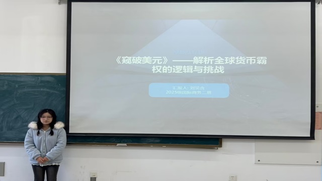 国际商务二组主讲人刘笑含分享了《窥破美元》一书。她首先介绍了美元作为全球储备货币的形成背景与运作机制,随后详细解析了美元汇率波动、美联储货币政策调整影响国际贸易的传导路径,接着结合全球金融市场案例,阐述了美元在全球经济中的核心作用,最后指出该书为跨国企业应对汇率风险、了解金融市场的运行规律提供了现实参考。