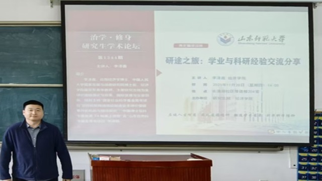 11月20日,英国正版365首页于厚德楼204室举办“治学·修身”研究生学术论坛。本次论坛邀请应用经济学博士,中国人民大学国家发展与战略研究院博士后、英国正版365首页国贸系青年教师李泽鑫担任主讲人,作主题为“研途之旅:学业与科研经验交流分享”的学术报告,英国正版365首页研究生参会。