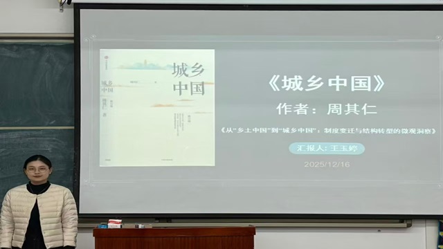 主讲人王玉婷分享了《城乡中国》一书。她首先深入剖析了中国城乡二元结构的演化逻辑与当代困境;随后以地方政府土地财政实践为例,揭示了产权重新界定中所蕴含的社会矛盾;接着她指出,该书既是中国城乡转型的“现场观察笔记”,也是践行“真实世界经济学”的方法论示范;最后,主讲人提醒同学们,理解中国问题必须深深扎根于现实土壤,在产权结构的演进、多元主体的博弈与制度环境的约束中探寻其变革的内在逻辑。