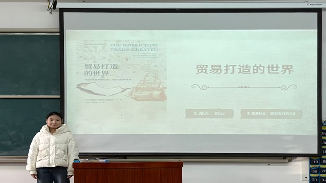国际商务一组主讲人刘云分享了《贸易打造的世界》一书。她首先介绍了作者彭慕兰(Kenneth Pomeranz)和史蒂文·托皮克(Steven Topik)的学术背景;随后阐述了贸易的本质——贸易不仅是经济活动,更是一种社会文化实践;接着,主讲人结合白银全球流动、鸦片贸易、香蕉贸易等案例,讲解了全球贸易如何重塑经济网络;最后,主讲人指出,贸易网络不仅塑造了现代世界的经济格局,也深刻影响着不同文明间的互动与演进路径。