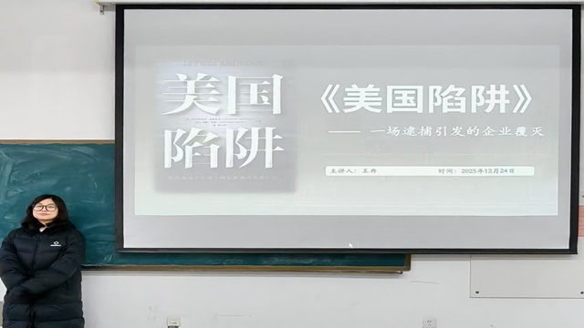 国际商务二组主讲人王冉分享了《美国陷阱》一书。她首先向同学们介绍了法国阿尔斯通事件——该公司因触及美国产业利益,遭到美国打压,最终被迫出售核心业务;随后,主讲人将核心业务出售事件的应对措施与孟晚舟事件的应对措施进行对比分析,揭示了美国司法霸权的本质,强调企业需重视地缘政治风险与合规建设;最后,主讲人强调企业需通过构建主动、前瞻且系统化的合规体系,才能在全球治理变局中实现可持续生存与发展。