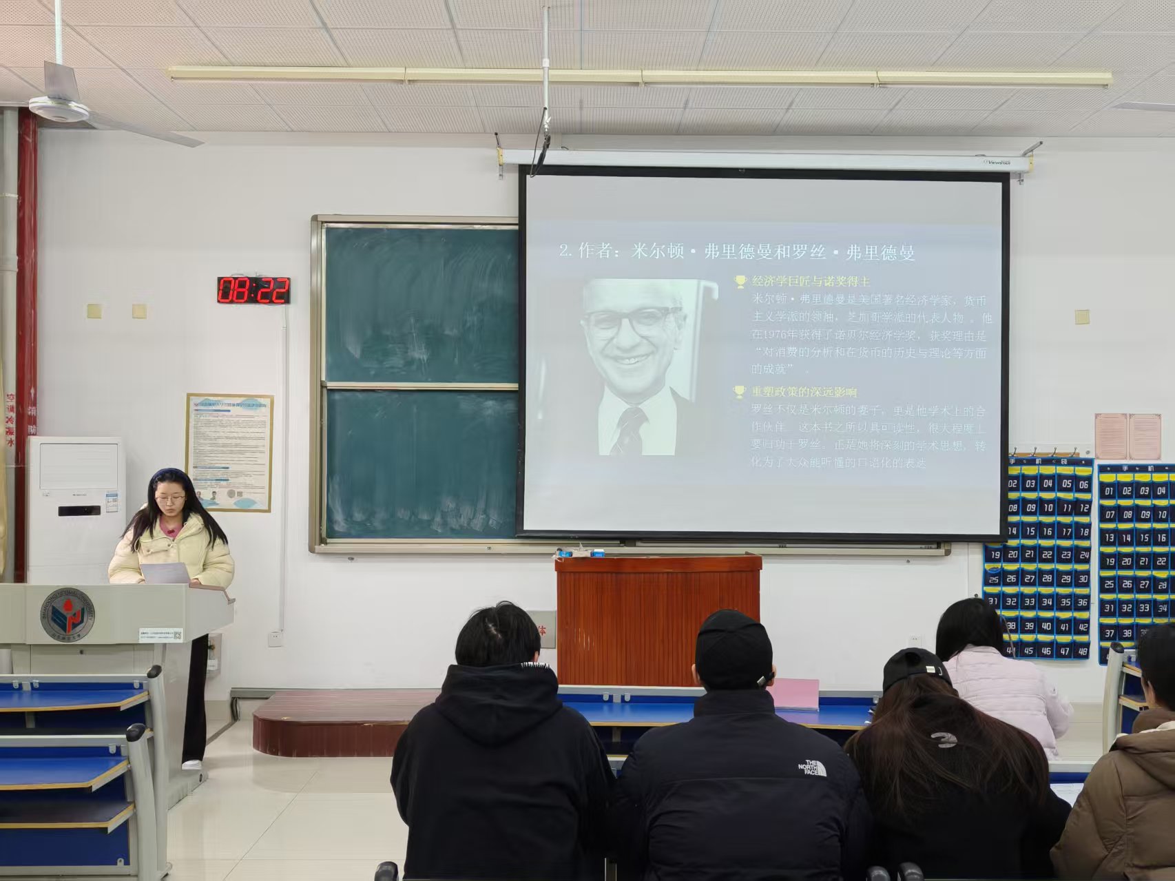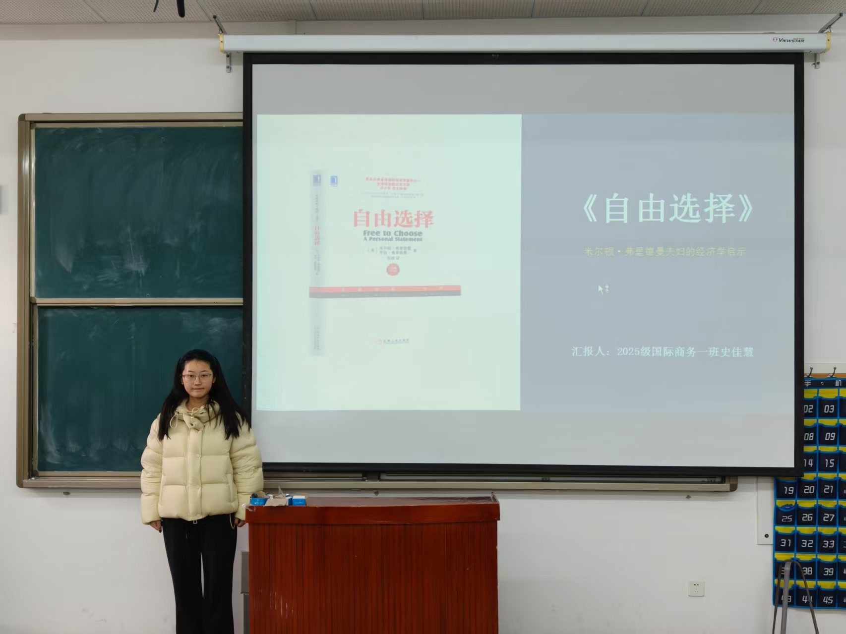 国际商务一组主讲人史佳慧分享了《自由选择》一书。她首先梳理出书中三大经济学观点:一是市场机制是基于自愿交换的高效组织方式,远优于强制命令的集权计划;二是政府需坚守有限边界,仅履行护国安民、建设公共事业等四项核心义务;三是价格机制是经济运行的核心,能传递信息、提供刺激并决定收入分配。随后,她通过铅笔的诞生、网约车动态调价等案例,阐释市场如何通过无形的手实现海量社会资源的高效协作与配置。最后,主讲人指出,无论是社会发展还是个人生活,都应遵守市场的自发秩序,坚守有限政府原则,在享受选择自由的同时承担相应责任,秉持独立思考的精神。