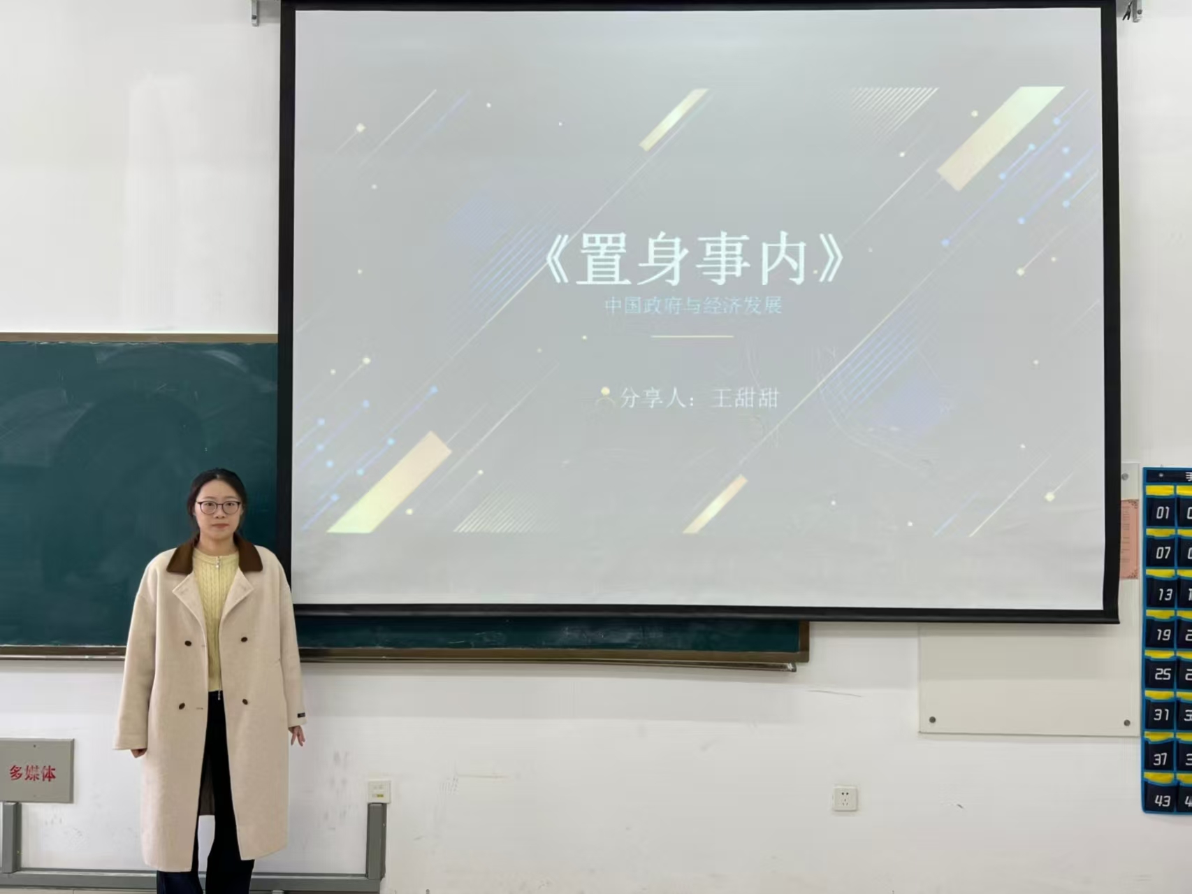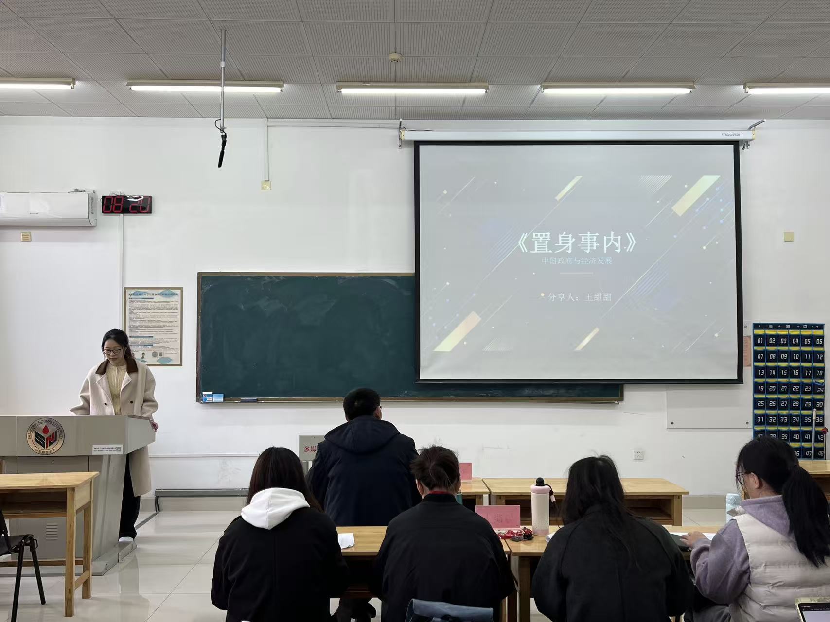 国际商务二组主讲人王甜甜分享了《置身事内》一书。她首先介绍了作者兰小欢的学术背景。接着从前言核心论点、地方政府运作的微观机制、微观机制塑造的宏观经济现象、政府转型的未来展望四个维度展开分析。最后,主讲人指出该书对同学们理解中国经济发展逻辑、把握政企关系演变具有重要意义。