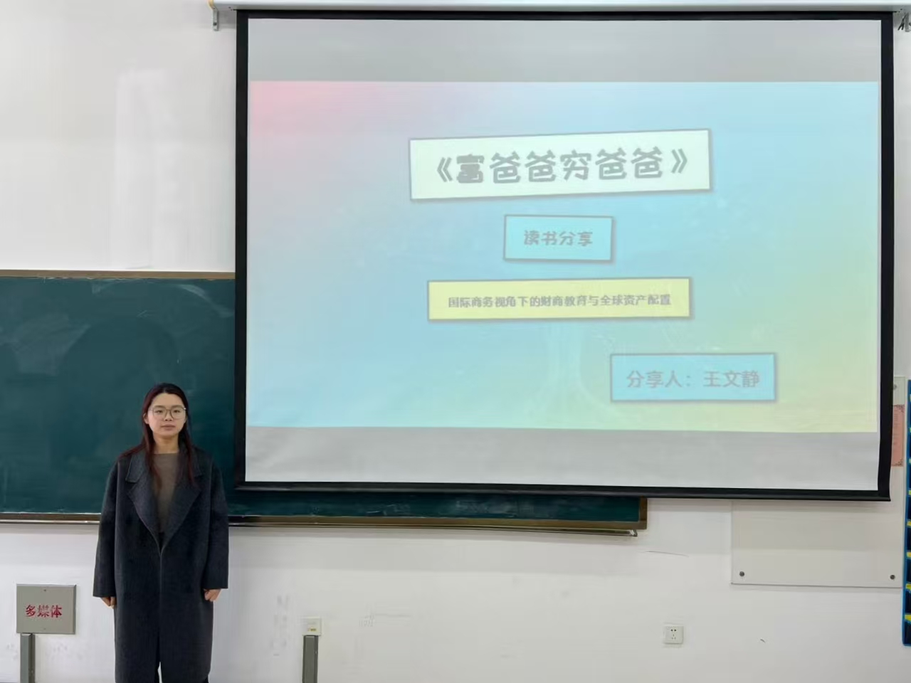 国际商务二组主讲人王文静分享了《富爸爸穷爸爸》一书。她首先介绍了作者罗伯特・清崎(Robert T. Kiyosaki)的背景——美籍日裔企业家、投资家与财商教育专家。随后,主讲人解读了书中的核心财商理念,阐释了资产与负债的本质区别,强调树立正确金钱观、提升财商思维的重要意义。最后,她指出《富爸爸穷爸爸》一书对当代青年提升财富认知、规划职业发展具有重要的指导价值。
