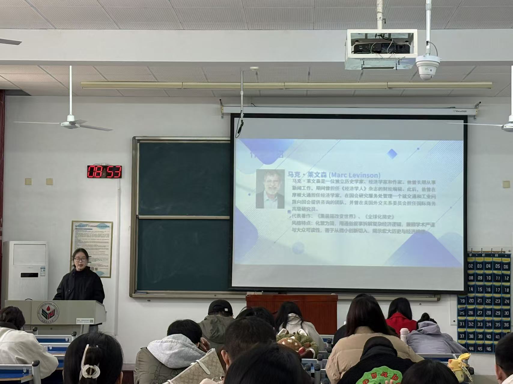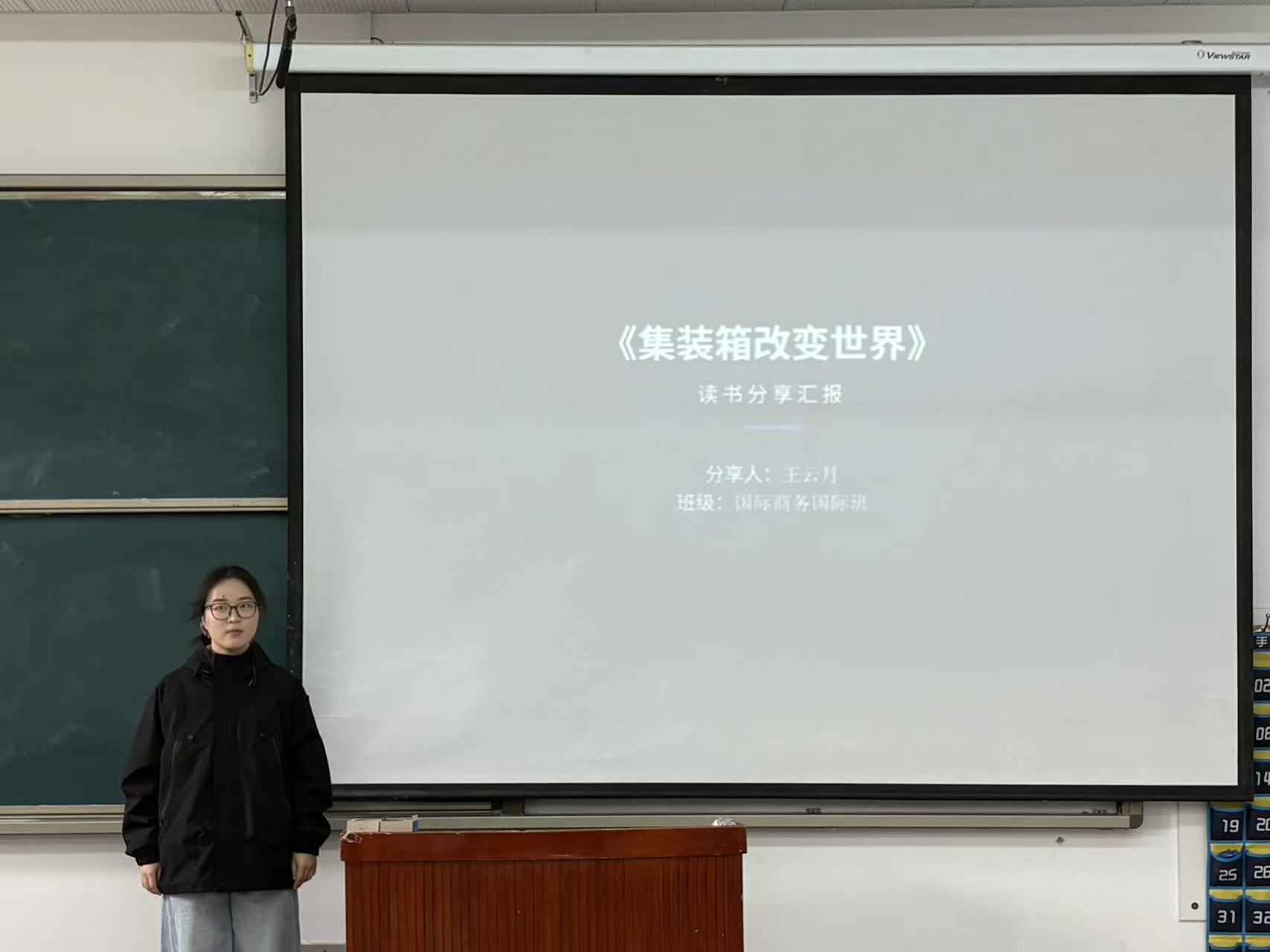 国际商务一组主讲人王云月分享了《集装箱改变世界》一书。她首先介绍了现代集装箱运输之父马尔科姆・麦克莱恩(Malcom McLean)的创新构想——拖车直装船。接着,主讲人指出标准化是集装箱能够撬动全球贸易的核心前提。最后,她通过详实的数据剖析了集装箱运输对全球贸易的深远影响——降低装卸成本,推动全球供应链形成与产业布局重塑。